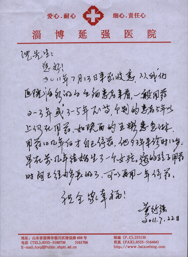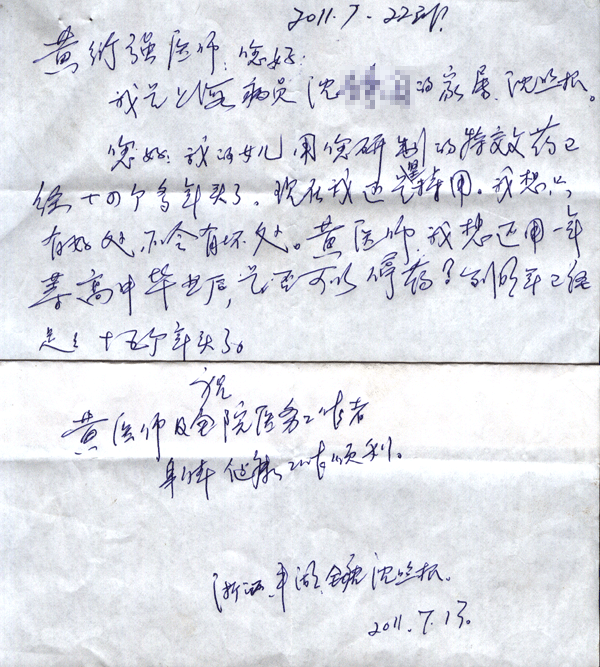 按语:近日接到浙江一位患儿家长的来信,信中讲到孩子患急性早幼粒细胞白血病(M3),服用我院药物近15年,准备停药。一般情况如服药3-5年病情持续缓解就可以逐渐停药,但是仍有不少患者坚持长期小量用药,如陕西的急性淋巴细胞白血病患者王斌,1993年,12岁时开始接受我院治疗,近期才停止用药,现在他的孩子都已经4岁了;北京的患者刘明珠,2000年9月开始服用我院药物,2008年停药,现在孩子已经2岁;再如上海的急淋白血病患者杨永,1997年来我院就诊,现在已经大学毕业参加工作。通过大量的临床实践可以证明中药疗效确切,而且长期服用无毒副作用。