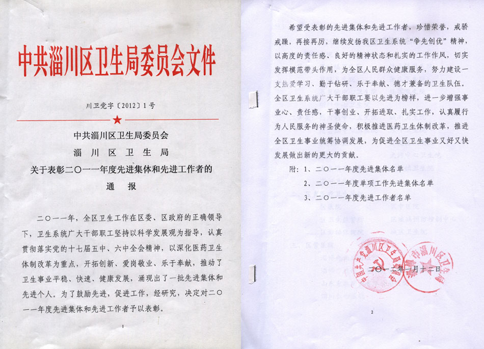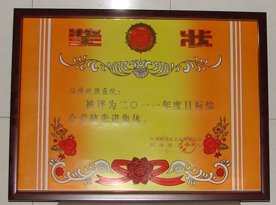 2012年1月13日,淄川区召开了2011年度先进集体和先进个人的表彰大会。我院被评为“2011年度目标综合考核先进集体”。黄衍强院长参会并代表我院上台领奖。我院将戒骄戒躁,继续以高度的责任感,良好的精神状态和扎实的工作作风,争取为更多的患者带去福音。