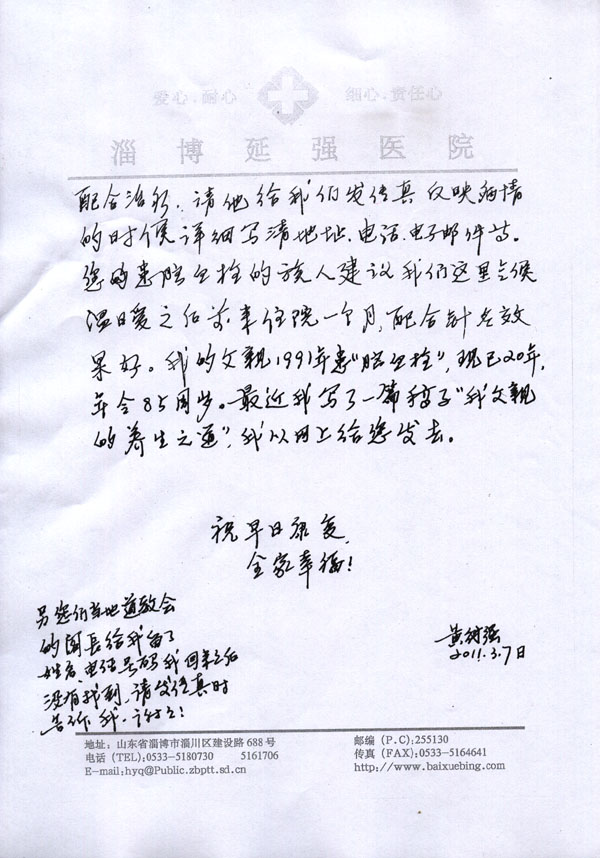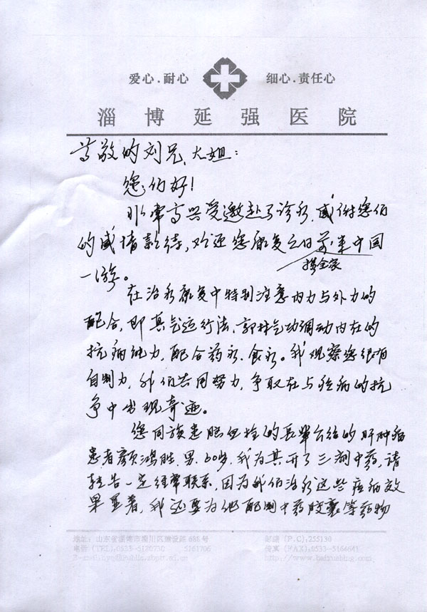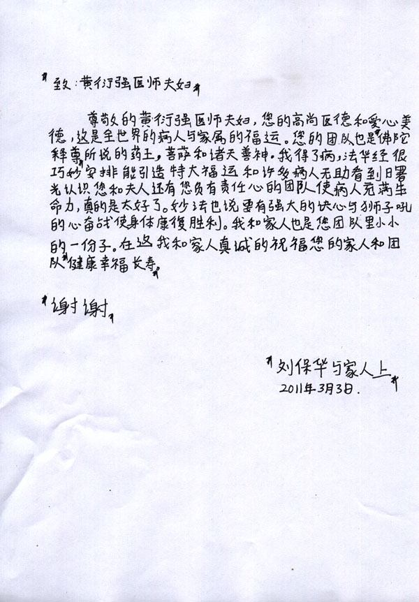 黄衍强院长于2011年2月23号到3月3号应邀赴马来西亚出诊期间,马来西亚白血病患者刘保华及其家人有感黄院长的高超医术和高尚医德,特发来感谢信。