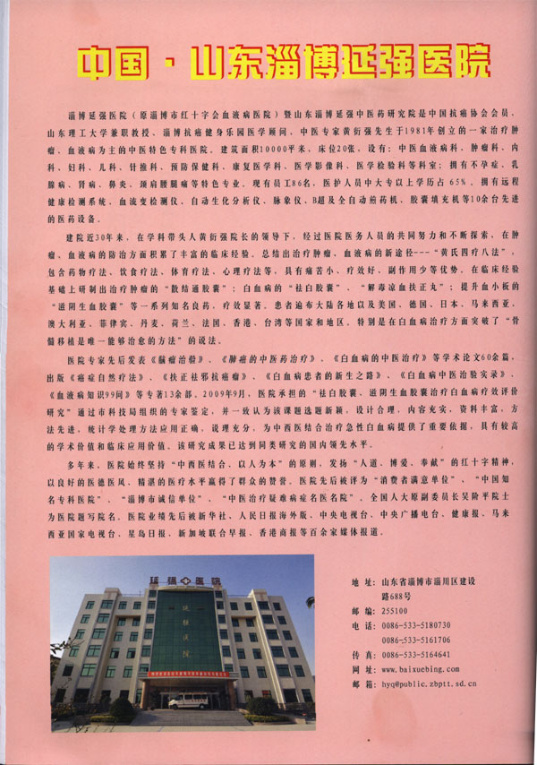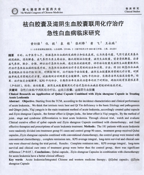 2010年10月1号举行的第七届世界中医药大会出版的《论文摘要汇编》,出版了我院论文《祛白胶囊及滋阴升血胶囊联合化疗治疗急性白血病临床研究》并配了专题说明,黄衍强院长并在会上做了演讲。
